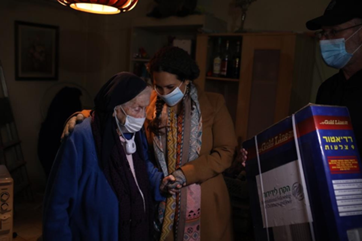 Yael Eckstein, President of The Fellowship, with staff delivering food boxes and winter supplies to 99-year-old Holocaust survivor, Shoshana. | Photo Credit: © 2021 IFCJ, photo by Avishag Shaar-Yashuv